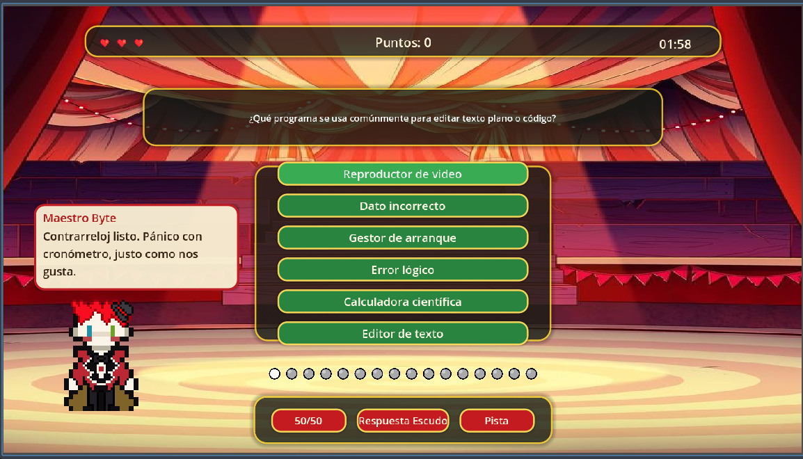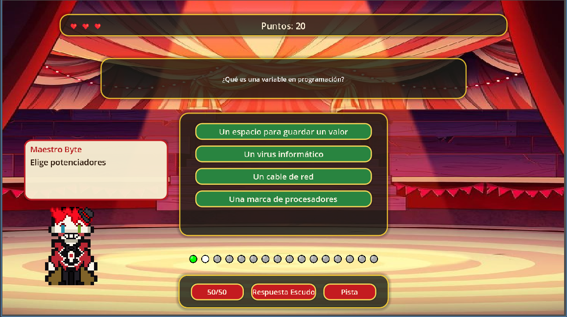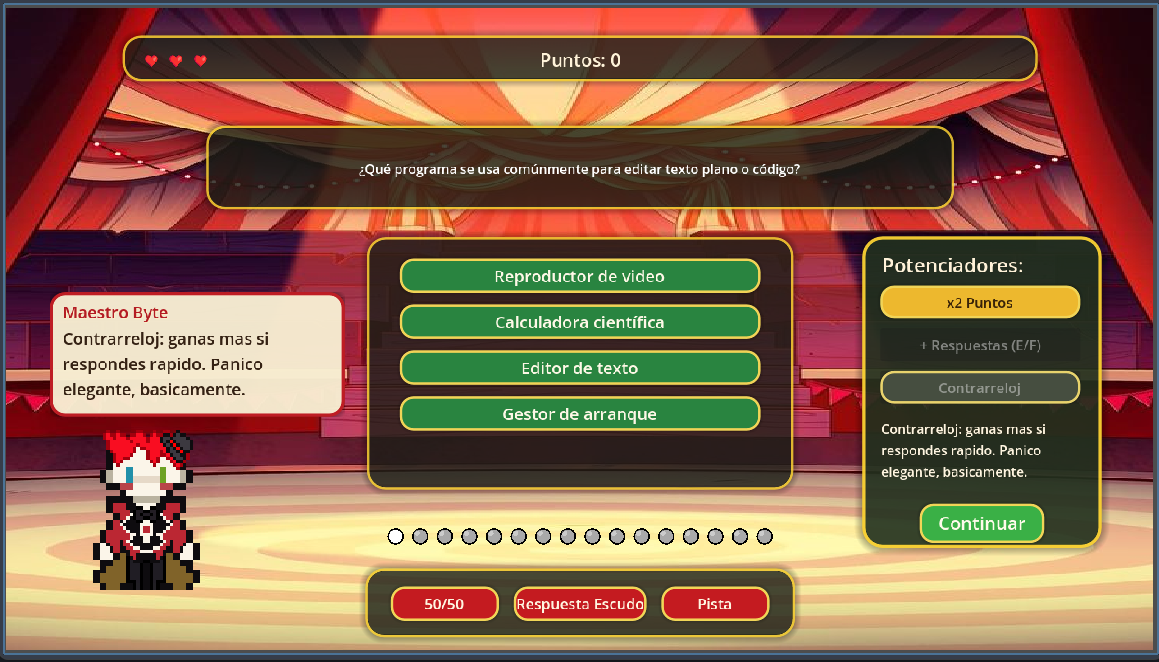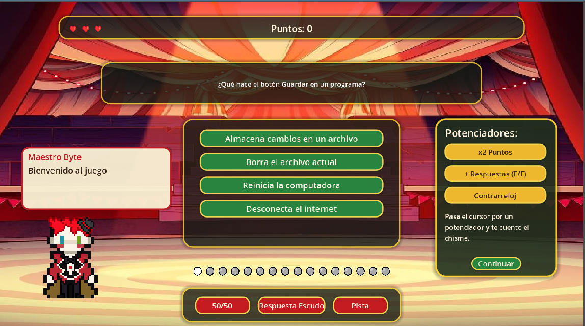 Preguntas de distintos niveles, comodines y potenciadores.